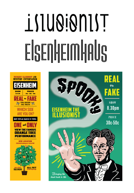 Created movie props for the Illustionist movie but set in a different time period. I choose to remake the theatre sign and posters in a 1950s style. The title was recreate to be an ambigram which means you can read it upside down or right side up.