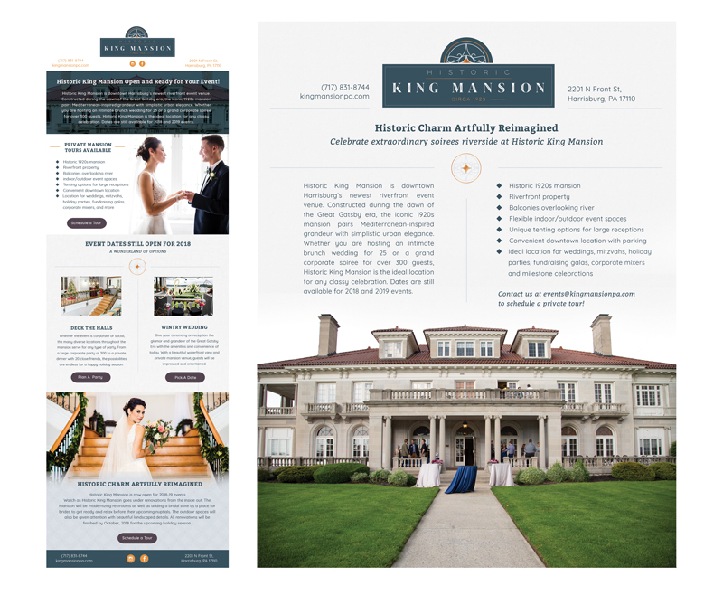 At the JDK Group, I had the opportunity to work on the Historic King Mansions new upcoming venue branding. I created email blasts, half and full page advertisements, wedding packages, started their instagram page and even helped set up scenes and attend to models on photoshoots.