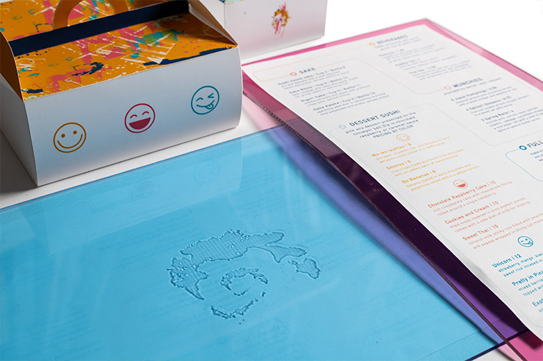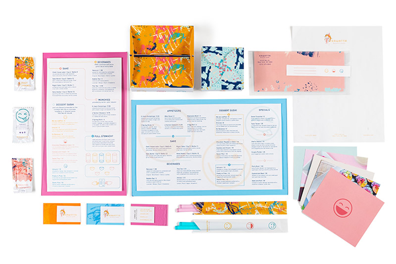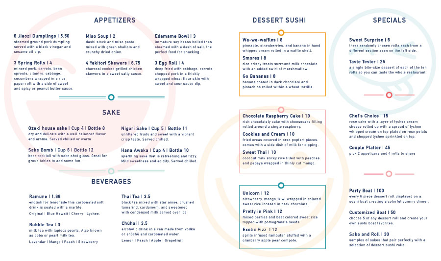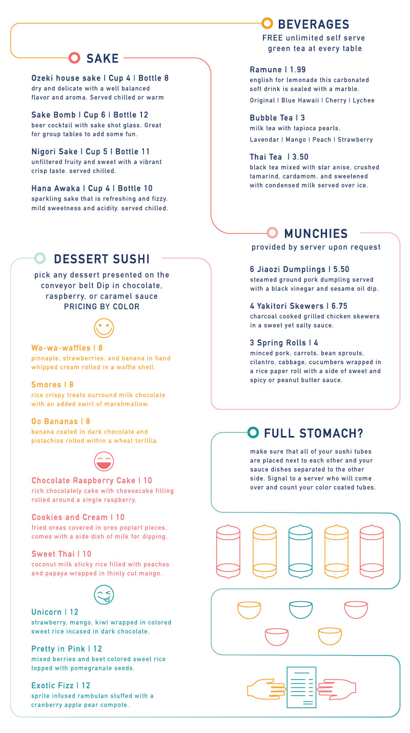 Kawatta is a restaurant that is modern yet fun with bright colors and fun textures created from real sushi. It has a convenient conveyor belt side where you can just pick up any dessert and stack your plates at the end or a nice sit down side great for parties. The name "Kawatta" means different or unusual in japanese representing the unusual twist on sushi the restaurant provides.