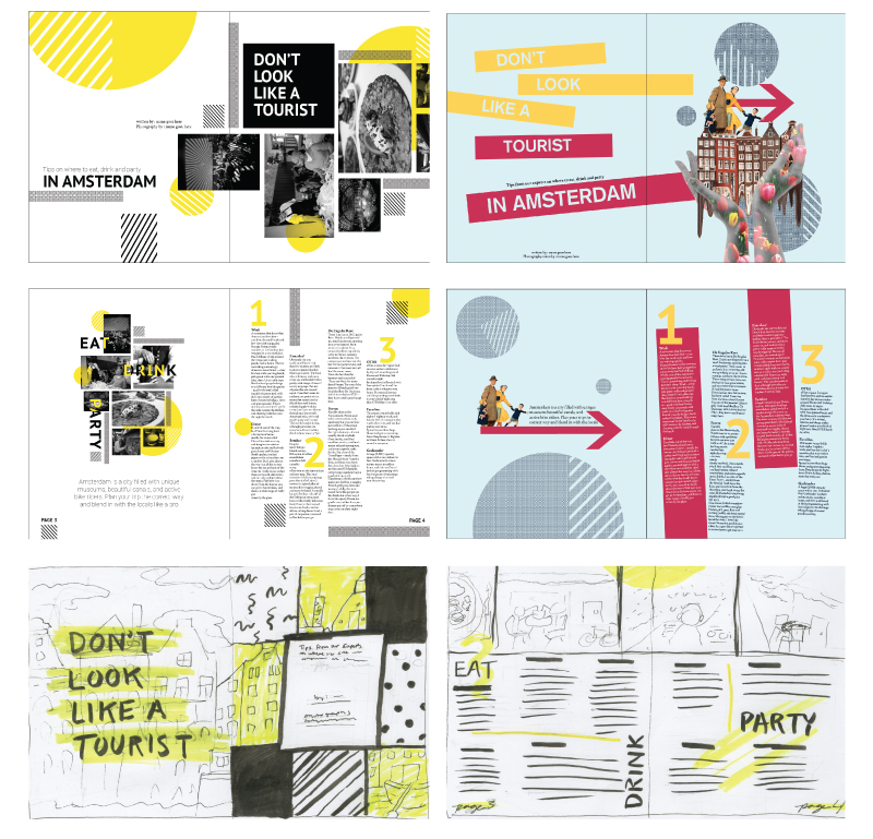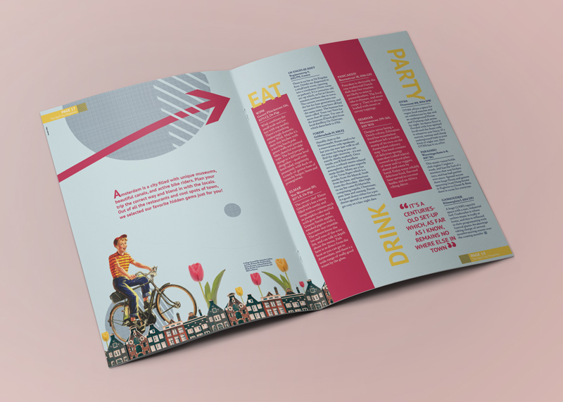 Society of Publication Designers’ magazine competition. Given 3 prompts, I chose one named “Don’t look like a Tourist in” and chose Amsterdam as my topic. I wanted to experiment with the collage style and bright colors.